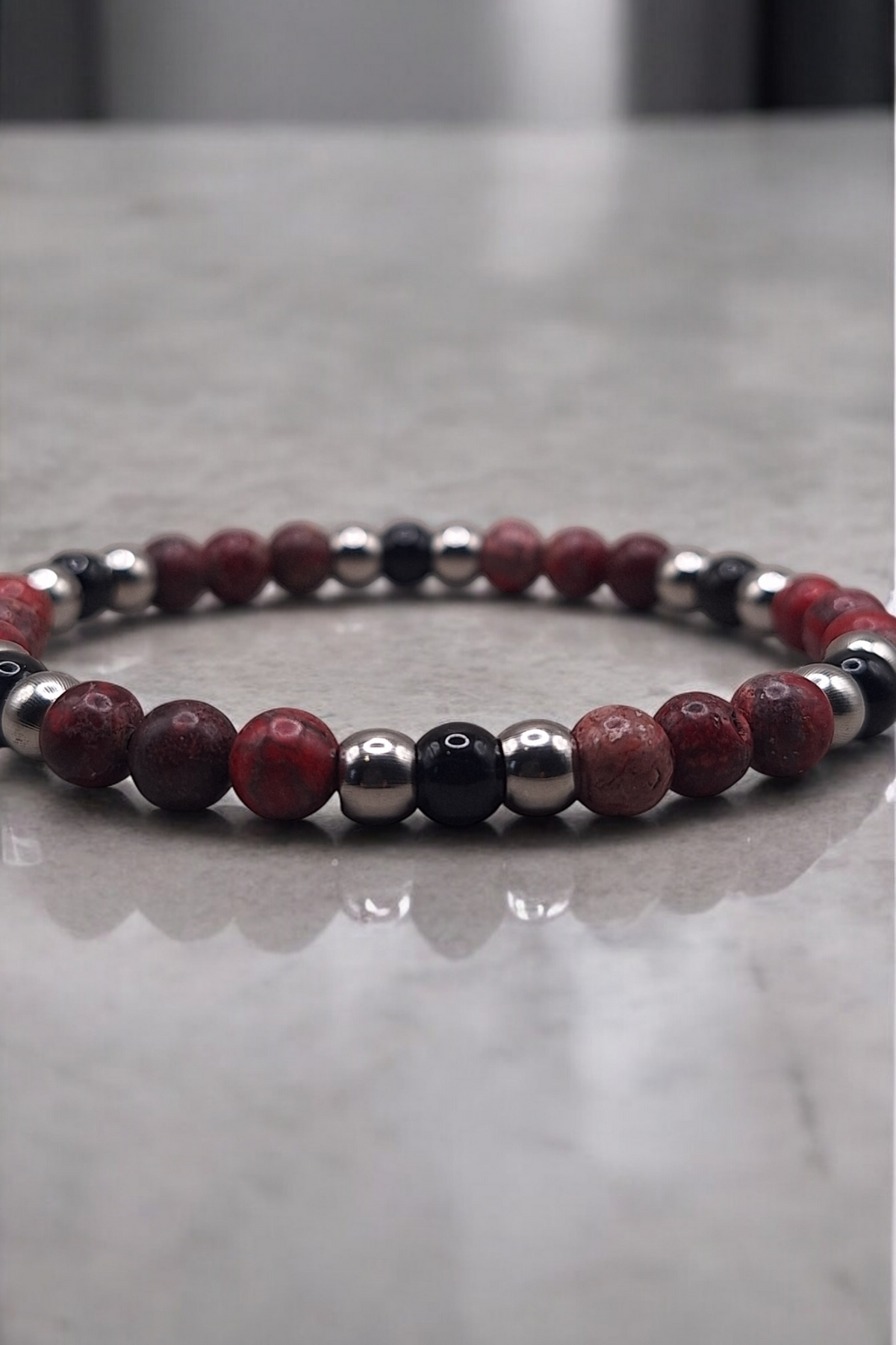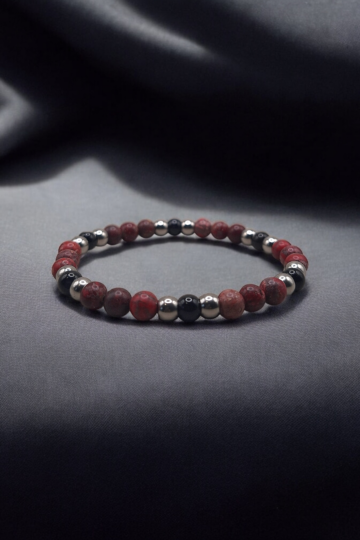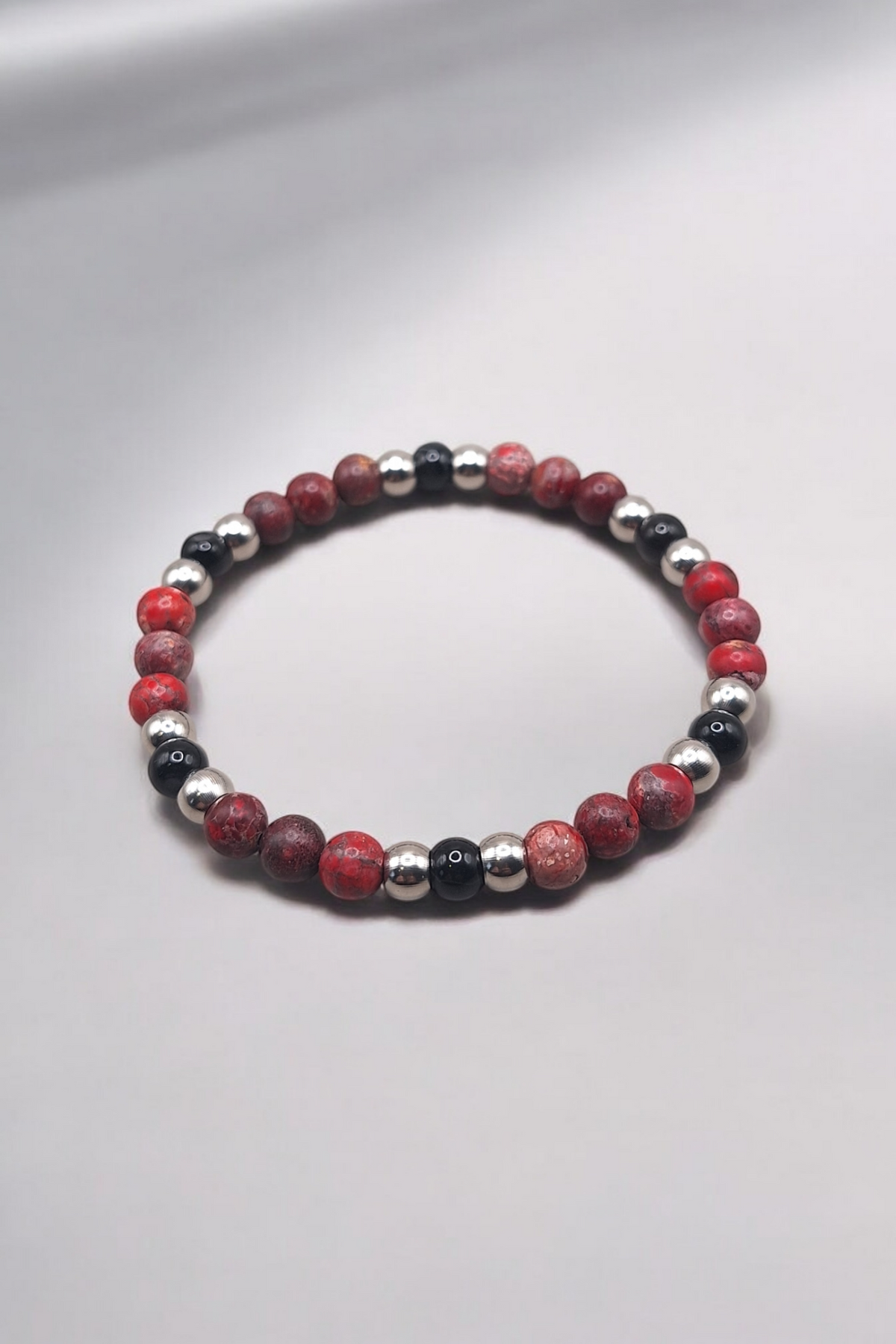 This King snake bracelet is crafted with genuine red Jasper and onyx stones for a bold and stylish look. Made to perfection with durable stainless steel in 6mm size, it's the ideal gift for someone special. Elevate your style with this luxurious and exclusive accessory.